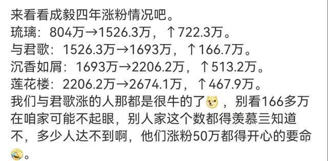 仅琉璃一部剧,就让成毅涨粉七百万。 一跃成为“千万流量”。 随后,2022年与顶流小花 杨紫 互助的 《千里香如屑》播出 。 又吸粉500万,再次跃升为两千万粉丝流量明星。