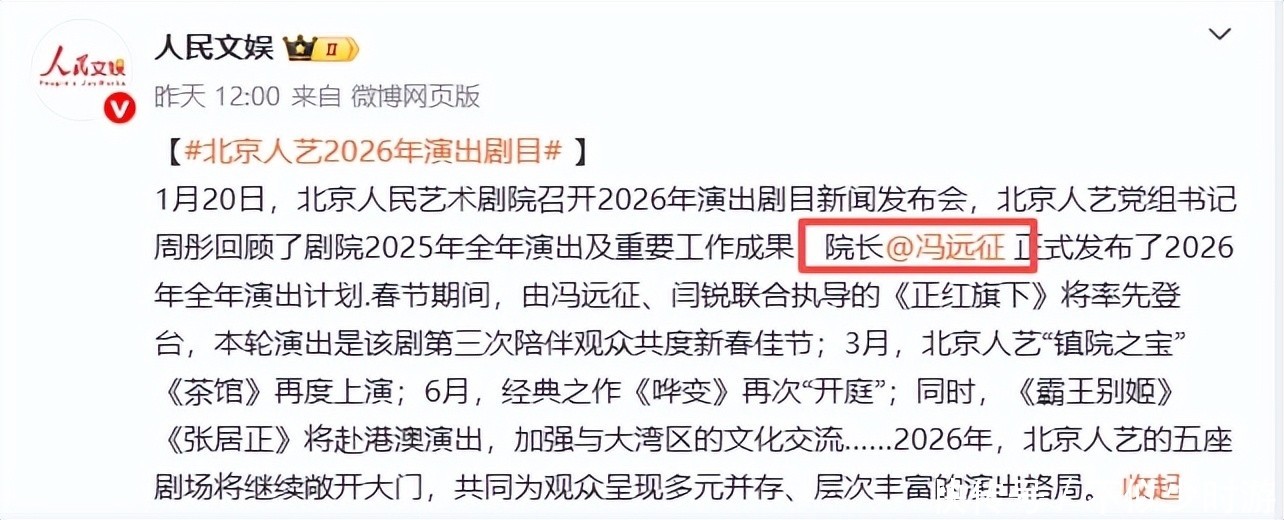 1月21日,东谈主民娱乐发达发布北京东谈主民艺术剧院2026年度上演安排,通稿开篇即落定称谓:“院长冯远征”。
